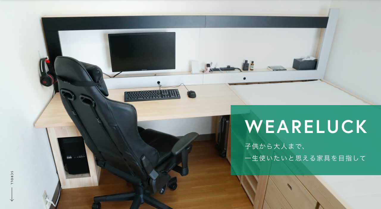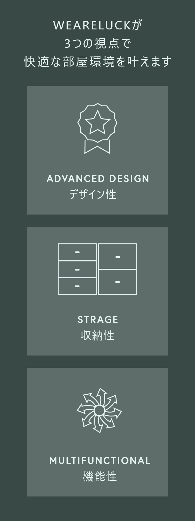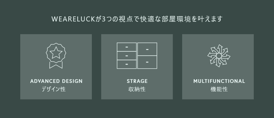 ブランドやデザインを重視すると使い勝手に問題があったり、逆に、収納量や機能性で選ぶとデザインがイマイチだったりと、家具や収納の悩みは尽きないもの。 WEARELUCKのルームキットは、そんな家具のよくある悩みを解決するために開発されました。建築設計の28年経験とノウハウを活かし、8年の歳月をかけて誕生したWEARELUCKは、デザイン性、収納性、機能性を備え、家具の課題だけでなく、部屋の環境改善までこれ一つで叶えることができます。