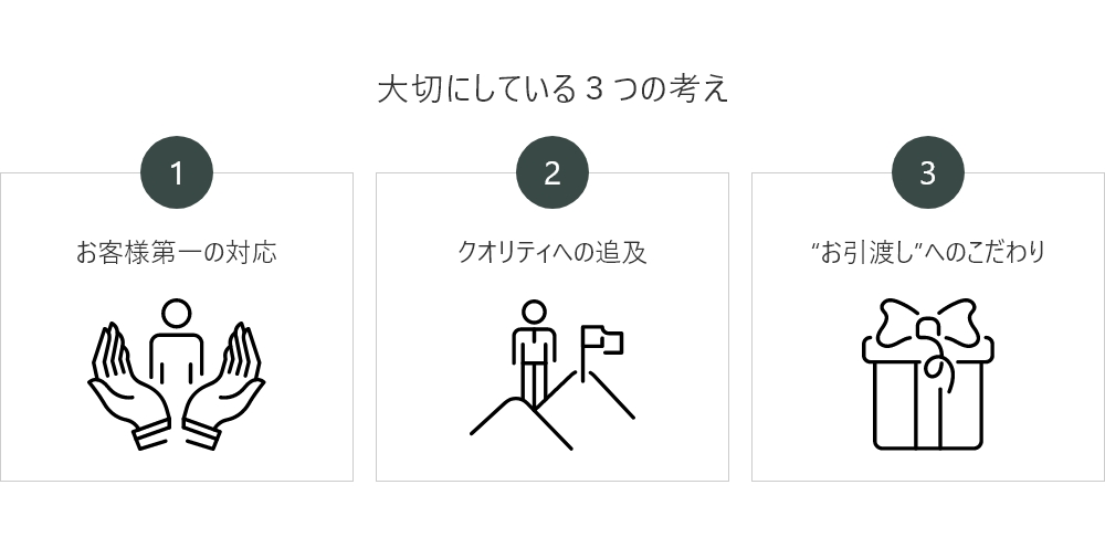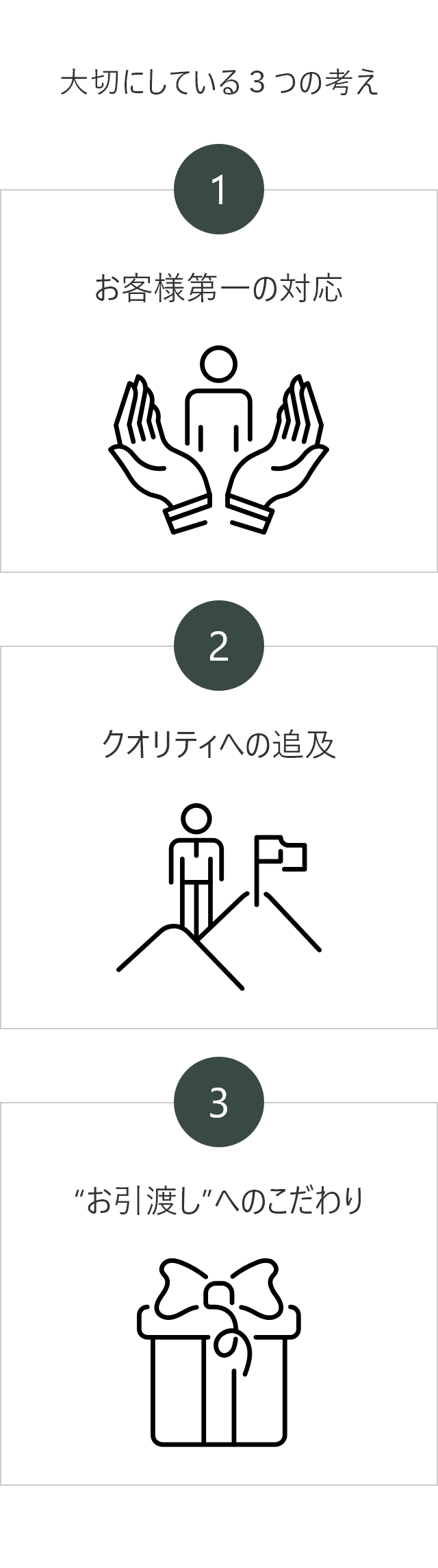 弊社の仕事は、住まいに関するお客様の望みを叶えることや悩みを解決すること。生活の基盤になる住まいに関わるということは、単に家やマンションを作ることがゴールではなく、その住まいで充実した豊かな日々を過ごしてもらいたい・・・そんな想いを込めて関わりたいと考えております。理想の住まいを作る為に、信頼関係も築いていくことが大切です。まずは一緒に未来の形を考えさせて下さい!